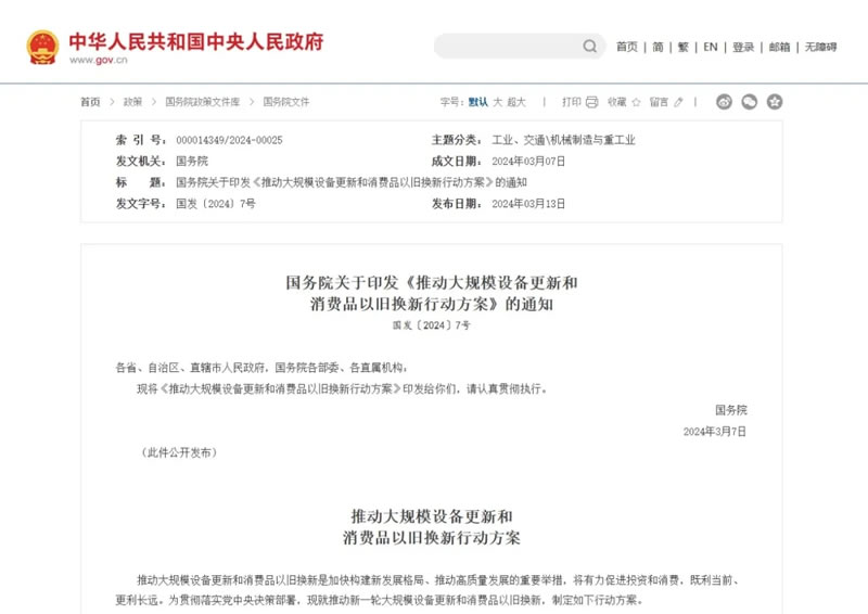 《推動(dòng)大規(guī)模設(shè)備更新和消費(fèi)品以舊換新行動(dòng)方案》的通知