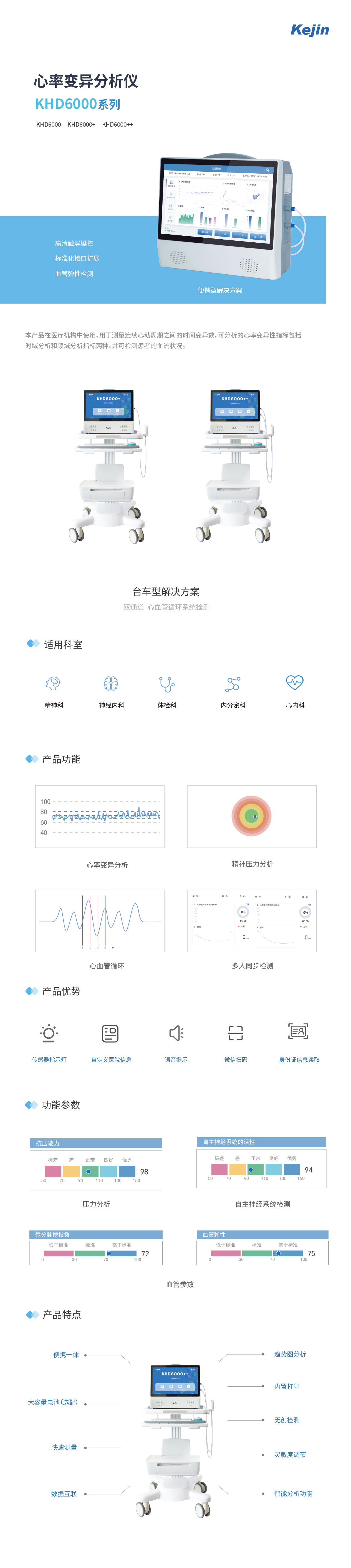 本產(chǎn)品在醫(yī)療機(jī)構(gòu)中使用,用于測量連續(xù)心動(dòng)周期之間的時(shí)間變異數(shù),可分析的心率變異性指標(biāo)包括時(shí)域分析和頻域分析指標(biāo)兩種。并可檢測患者的血流狀況。